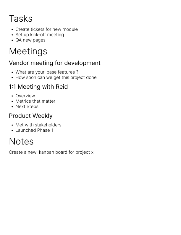 The journal entries consists of a daily document that captures the tasks for the day, sections for each meeting and an extra section for miscellaneous notes. Similar to a traditional journal entries are tied to that day but are created at the beginning of the day and is updated throughout the day as task are completed, meetings take place or any other daily needs for note capture. Here is a peak into my process.